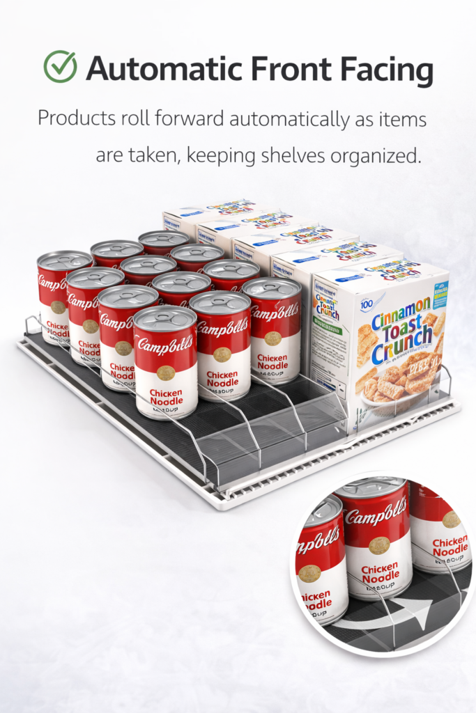 • Automatic Front Facing – Products roll forward automatically as items are taken, keeping shelves organized.
